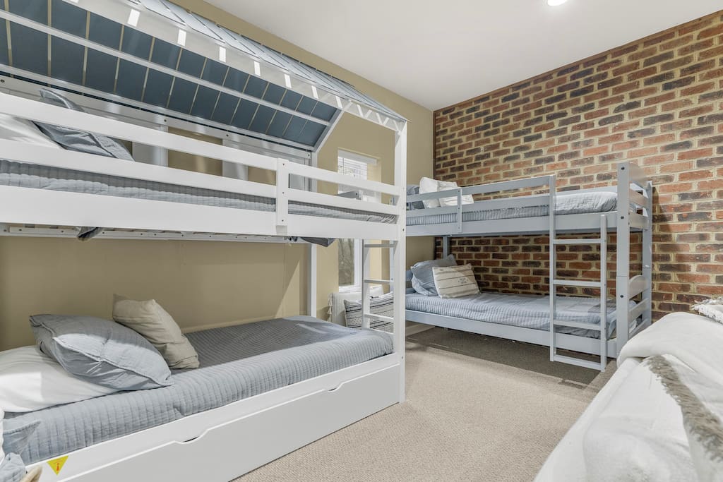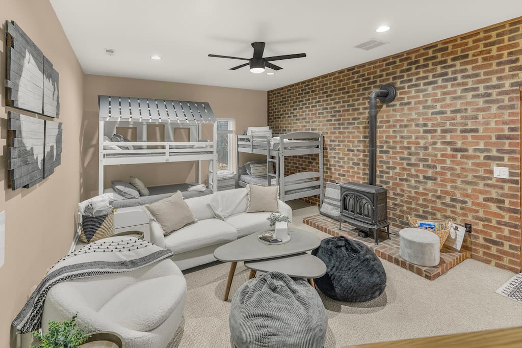 The home layout is as follows: Upper level: BR1: Primary bedroom suite with king bed, sitting area, and ensuite bathroom with dual vanities, shower, and soaking tub Main level: - Great room with large TV and propane fireplace, open to dining area - Dining table seats 8, plus the eat-in kitchen has a table that seats 6 more - Kitchen is fully stocked with everything needed to prepare meals. Ground coffee and k-cups provided. - BR2: King bedroom - BR3: Queen bedroom - Hall full bath with shower/tub combo - Screened in porch with comfortable seating around propane fire table, plus dining table for 4. - Small deck with grill - Game room in converted garage with air hockey, shuffleboard, foosball, arcade game, and couch/TV area. This room does have both heat and A/C. Lower level: - BR4: bunk room / additional living room with 2 sets of twin-over-twin bunks, plus a twin trundle. Sitting area with TV - Half bath - Access to hot tub area, plus a conversation set with seating for 4 Things to do nearby: The house is about an 8 minute drive to the slopes, pool, and dining at Massanutten, 6 minutes to the spa, and 2 minutes to the indoor/outdoor Waterpark. The Swift Run Gap entrance to Shenandoah National Park is 15 minutes away with some of the best hiking on the east coast. JMU and everything else in Harrisonburg is 20 minutes away, and there are several breweries, wineries, and restaurants within 15-20 minutes of the house. Other things to note: - We provide our guests $1500 of coverage for accidental damage to the property or its contents. The cost of this is already embedded in the cleaning fee. - Massanutten offers hiking, skiing, snowboarding, tubing, swimming, dining, spa, ropes course / zip line, golfing, go carts, mini golf, and much more. - There is a flat driveway with room for 4 vehicles - Wifi is fast with a strong signal throughout the house and decks. All 4 bedrooms, plus the living room and game room, feature smart TVs where you can access all the main streaming services. - We provide a fully stocked coffee bar with multiple coffee drip and Keurig options - Guests can enjoy community pool access in the summer season for a $6 per person fee. - Linens and towels provided - Due to wildlife, trash must be taken to the Massanutten community dumpsters - We do require a separate rental agreement, which we will send a link to e-sign after you book. There are no additional fees beyond those listed here. Lastly, this property is located within an HOA that requires the community rules to be posted here, so here are those rules: WELCOME TO MASSANUTTEN! This home is in a private residential neighborhood and is part of the Massanutten Property Owners Association (MPOA), governed by its rules and regulations. There are rental homes in all MPOA neighborhoods, but people also live here. Your nearby neighbors may be full-time residents, including families with children, retirees, second-home owners and other guests enjoying their retreat. NOISE • Quiet hours: 10:00 PM - 7:00 AM. • Keep noise indoors during these hours. • No excessive noise at any time, as judged by MPOA or its assigned agents. PARKING • Keep all tires off the road. • Don't block fire hydrants or park in front of another property without written approval from your host. • Park only in designated areas or overflow lot (4007 Peak Dr., Massanutten, VA 22840) • No buses, campers, or RVs to be parked at homes or on roads. Overflow lot is available with written approval from your host. OUTDOOR FIRES • High wildfire risk area! • No open fires. • No unattended fires. • No firepit use during quiet hours (10:00 PM - 7:00 AM). • Firepits and grills may be restricted during local emergency conditions, check MassanuttenVillage(dot)com or electronic sign at entrance for updates. ALCOHOL No open containers on roads or in common areas. PETS • Leash always required when outside. • Clean up after your pets. TRASH • Do not place garbage/trash outside, including screened-in porches, decks or carports. Trash attracts wildlife, which could endanger you and damage the property. • Dumpsters are located at 4003 Peak Dr., Massanutten, VA 22840